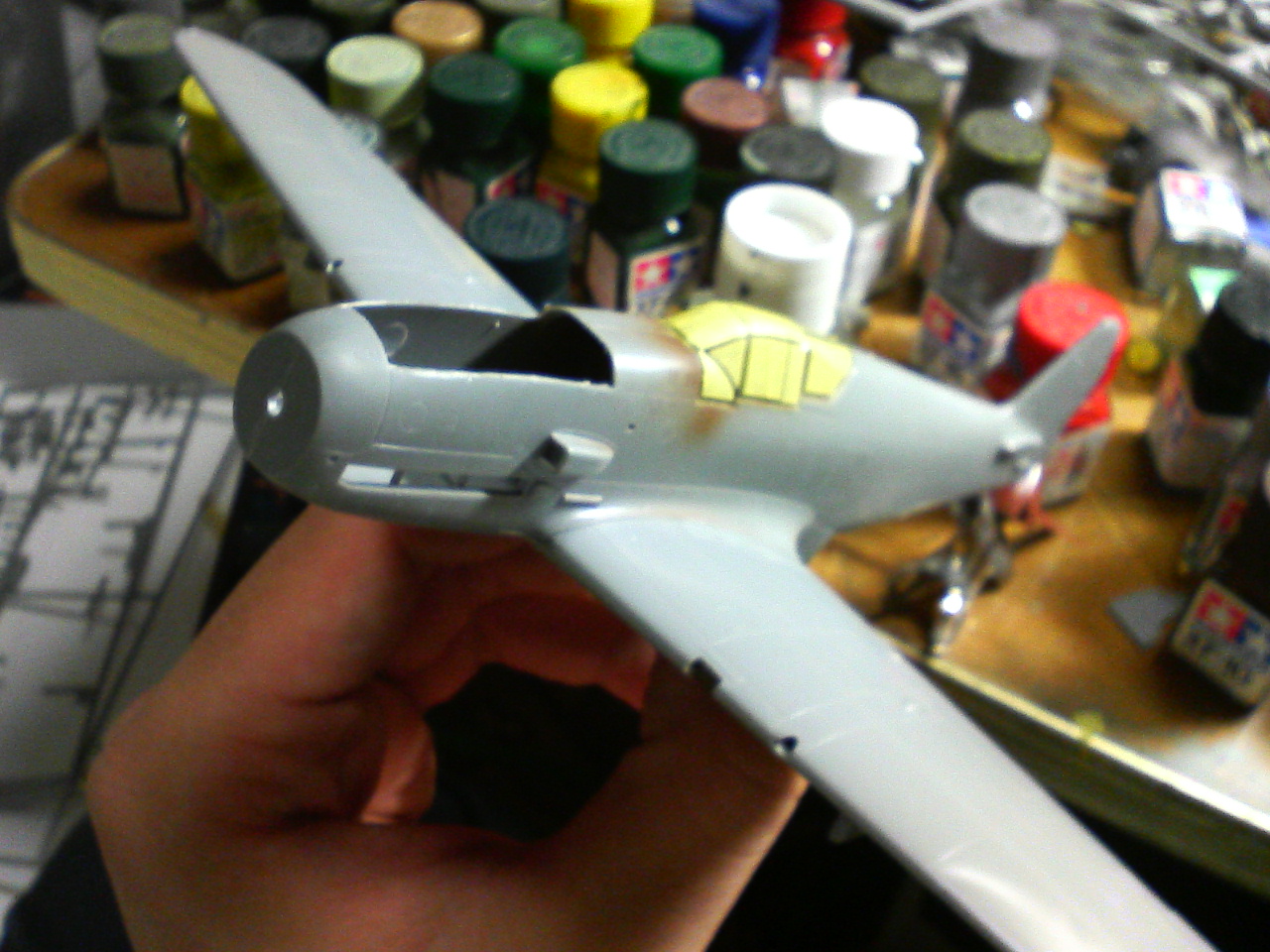 いや、前回見た通りキャノピーがパックリ逝ったから三式戦を作ることに、キャノピーのマスキングはパックリヤッたノリでやってるからあとは組み立てるだけ(それが一番の問題なんだけど)組み立て自体は結構楽、ちなみに左の写真を撮ったのは右より前、右で機首のパネルを外してるのはプロペラに止め具がなかったからゴム栓を付けるために外したんだけどハセガワさん、なんで飛燕のペラ止められないの?