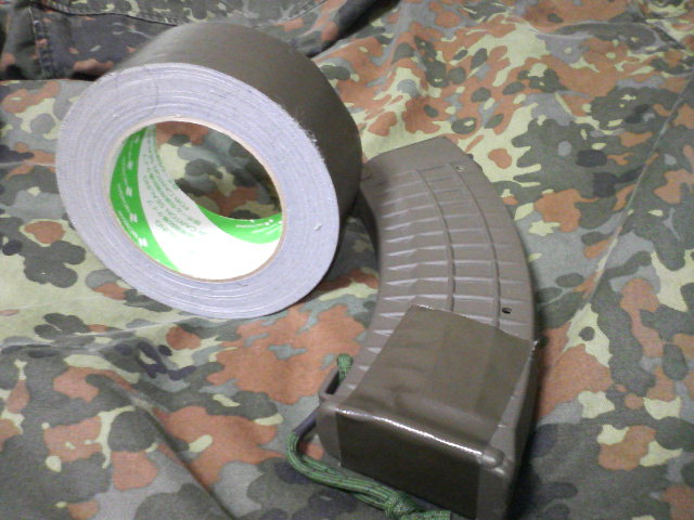 実は件のAK47改に付いてきたG&Pの150連ワッフルパターンマガジン(OD)ですが装着状態で押すとロックが外れて底蓋が動くトラップがあって過去1回部屋で無くして散々さがしたので自A隊御用達と銘打たれたOD布テープを買ってバシッとはっつけてやりました