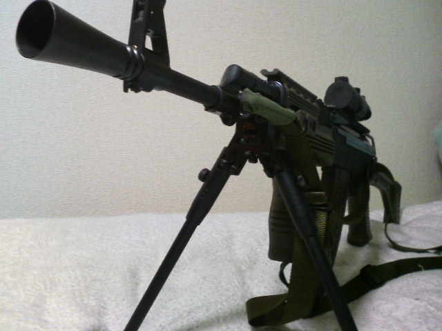 バイポッドはノーベルアームズのアンダーバレル対応バトルバイポッドでこれのおかげでトップヘビー気味で体感重量がアップしてます。AKにはフォアグリップがあるのでそんなに重く感じません