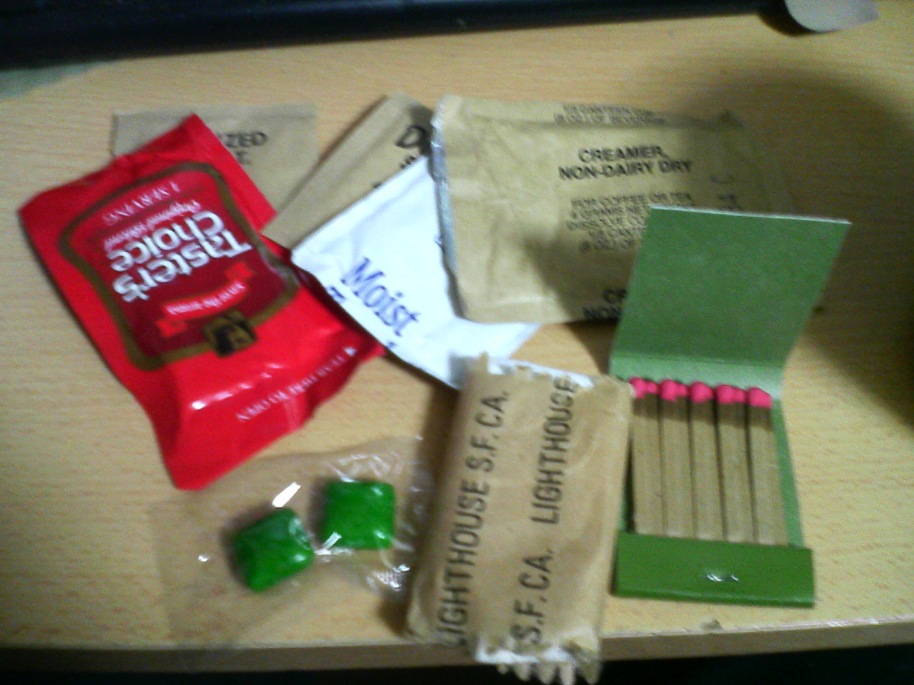 内容物はガム、マッチ、コーヒー(ネスカフェ)、ちり紙、ナプキン、塩、砂糖、クリーとここには写っていませんが親指大のタバスコが入っています。