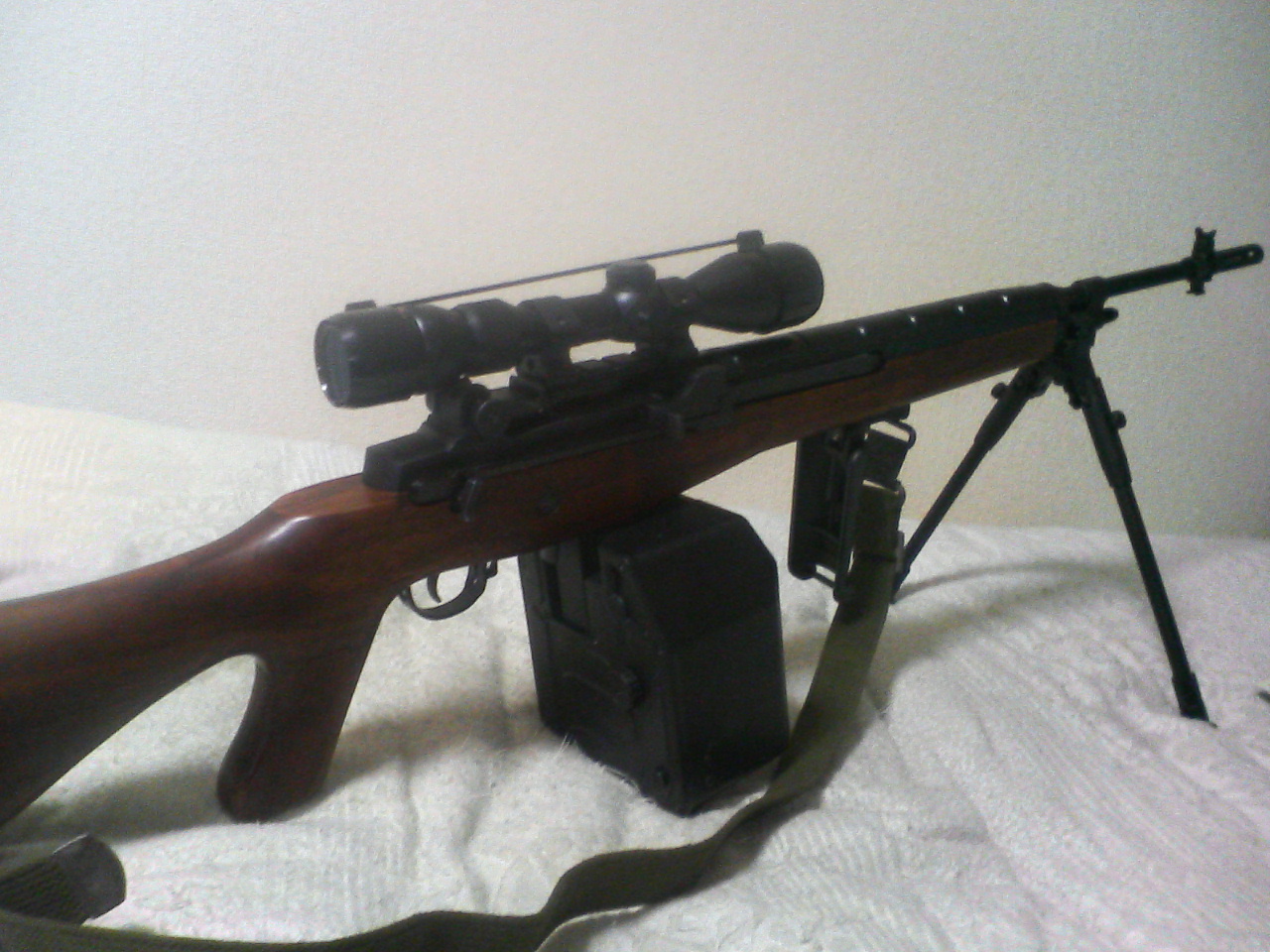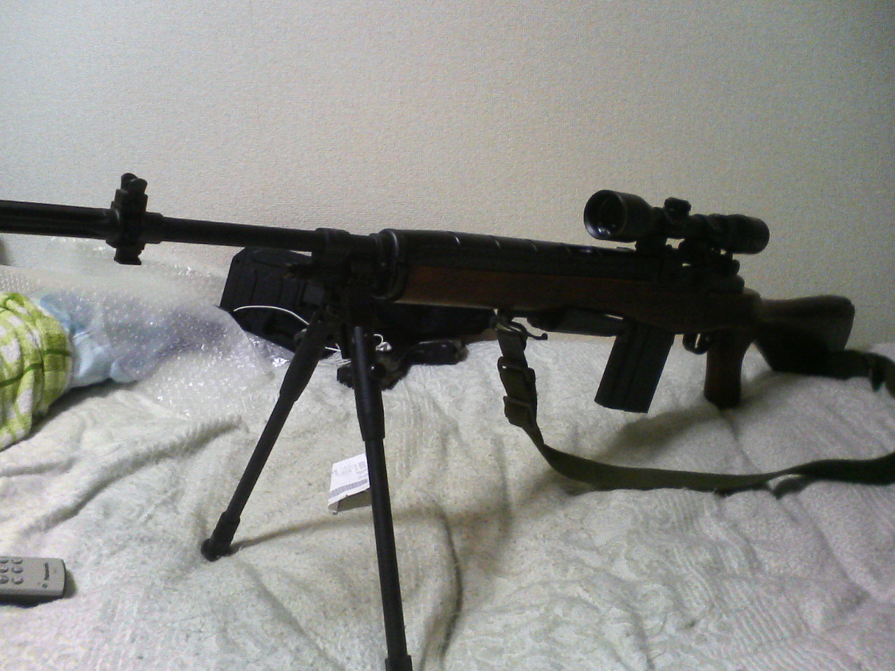 ついでにM14/M16用実物スリングも装着しました。(ただスリングスイベルが折りたたんだバイポッドと干渉するので使いにくかったりしますが・・・)